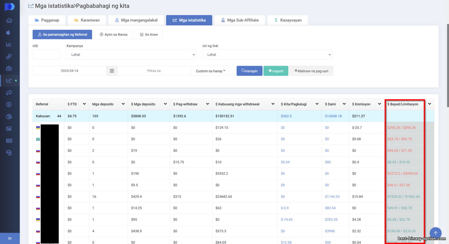 Makikita mo rin ang impormasyon sa bawat trader na na-refer mo (naka-anonymize ang pangalan, ipinapakita bilang ID). Nandoon ang petsa ng kanilang rehistro, unang deposito, total deposits, total withdrawals, bilang ng trades, kita ng broker mula sa kanila, at komisyon mo. Napakadetalyado nito, kaya makikita mo kung sino ang pinaka-aktibo at puwede mong bigyan ng dagdag-pansin (halimbawa, kung mayroon kang VIP chat para sa iyong pinakaaktibong referrals). Tinutulungan kang masubaybayan ang aktwal na kalidad ng bawat traffic source.