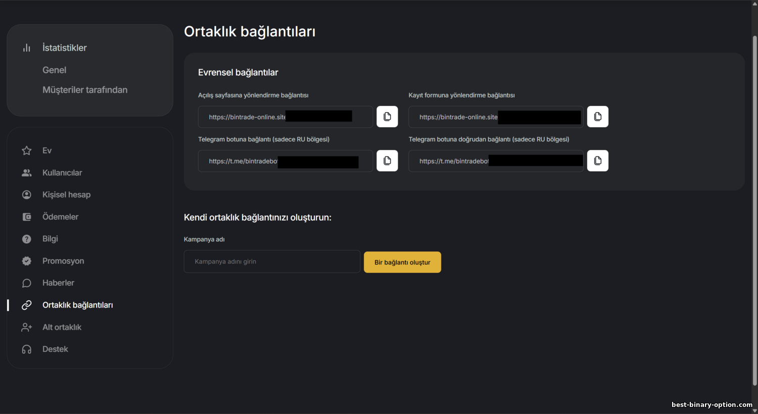 - Hakbang 3. Kumuha ng referral links at materyales. Sa dashboard, i‑generate ang iyong natatanging referral link. Kadalasang makikita ito sa pangunahing pahina — gaya ng https://bintradeclub.ru?ref=your_ID. Ang sinumang mag‑click sa link na ito at magrehistro ay maitatalaga sa iyo. Kung pinahihintulutan ng programa ang paglikha ng dagdag na link (sub‑ID), gamitin ang mga ito para sa iba’t ibang channel. Bisitahin ang seksyong “Promo” upang makita ang mga banner sa iba’t ibang sukat na mada‑download o makopya ang code. Maaaring mayroon ding handang landing pages — suriin at piliin ang babagay sa iyong traffic. Para sa English‑speaking audience, tiyaking gumamit ng English creatives (available ang site ng BinTrade kahit sa Russian at English). Kopyahin ang mga link at banner code — kakailanganin mo na ang mga ito sa susunod.