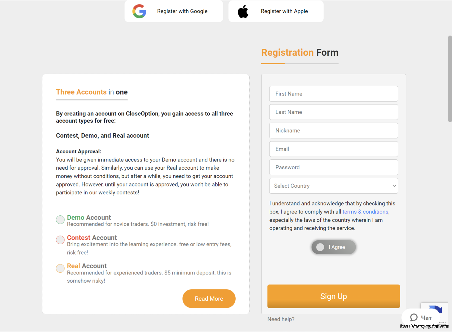 Binibigyang-diin ng broker na kailangang tiyakin ng mga kliyente na hindi labag sa batas ng kanilang hurisdiksiyon ang pangangalakal ng options. Sa pangkalahatan, bukas ang CloseOption sa karamihan ng mga bansang wala sa restricted list at binibigyang-diin nitong handa silang makipagtulungan sa mga trader mula sa US.