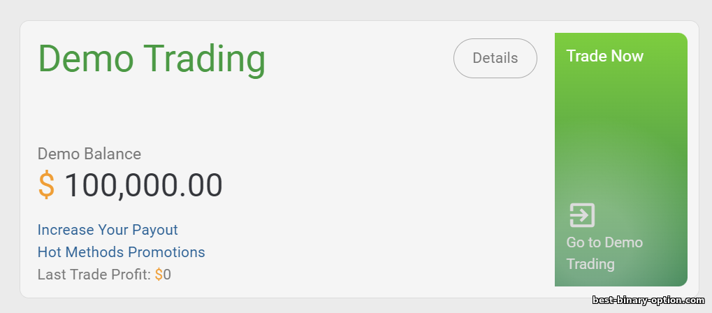 - Demo account: May kasama itong $10,000 na virtual funds (maaaring dagdagan hanggang $100,000). Pareho ang mga kondisyon ng demo at real—parehong plataporma (TradeRoom), parehong asset, expiration, at payout. Napakahalaga nito para sa mga baguhan na nais munang magpraktis nang walang panganib.