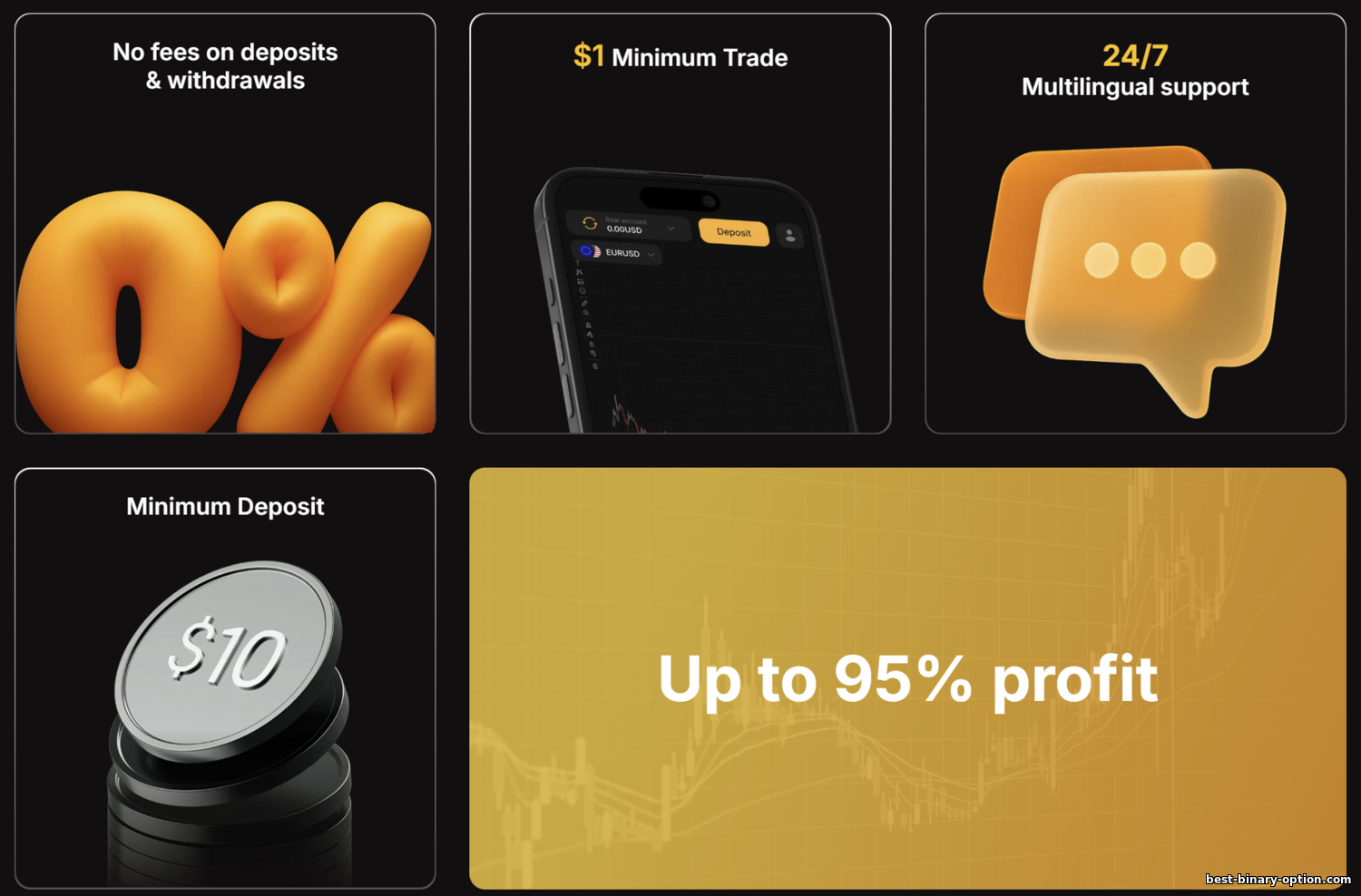 | 24/7 crypto trading: puwede kang magtrade ng digital assets kahit weekend. | Walang extra features: classic “higher/lower” options lang. Walang early close, rollover, o copy trading. |
