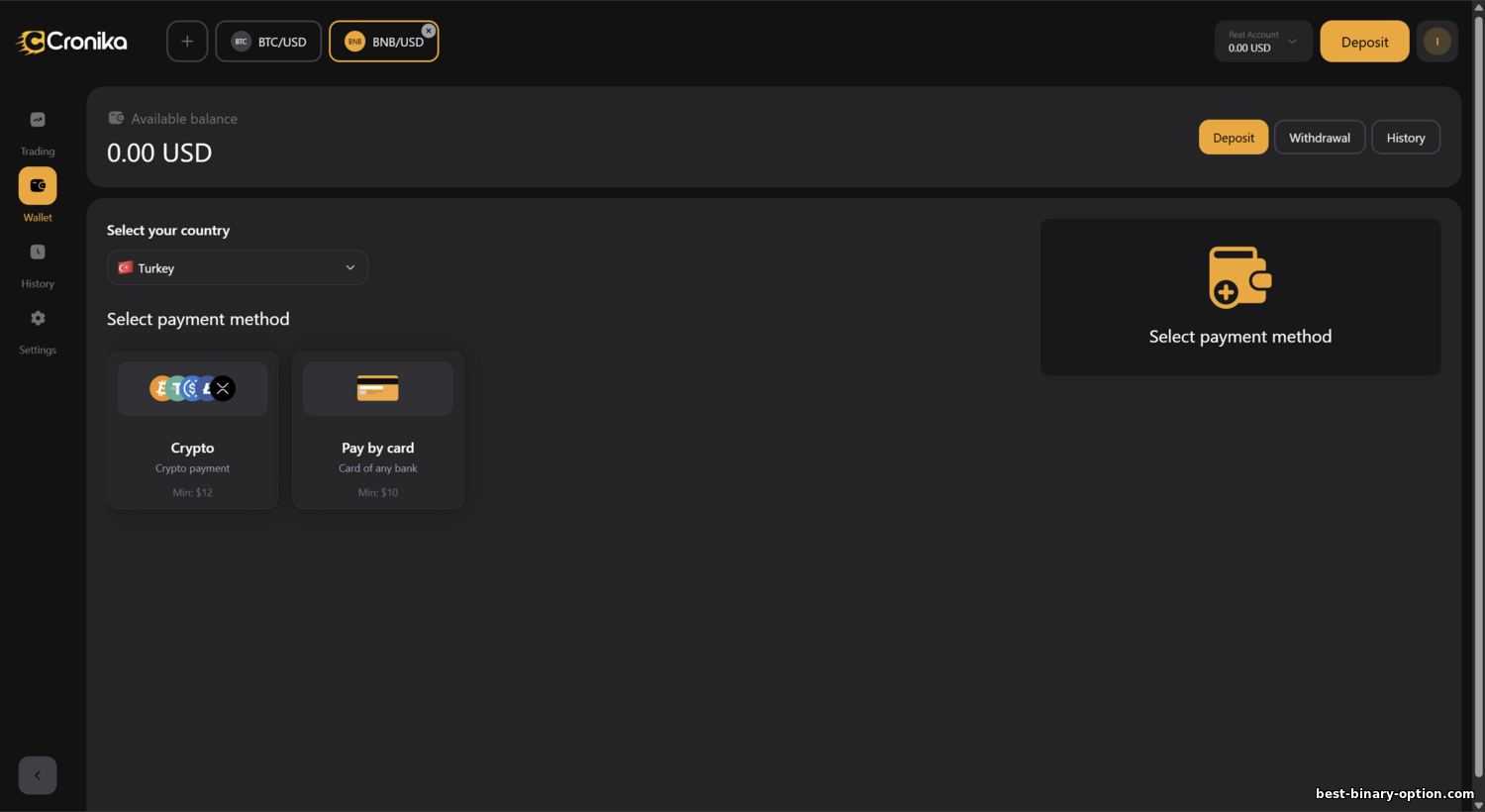 1. Mababang minimum deposit at napakadaling simula. Namumukod ang Cronika dahil minimal ang requirements para makapagsimulang magtrade. Puwede kang magbukas ng live account sa $10 lang, at $1 ang minimum stake per option. Isa ito sa pinakamababang entry threshold sa industriya. Kung ikukumpara, maraming regulated brokers (lalo na sa Europe) ang madalas nangangailangan ng $100 o higit pa. Dahil mababa ang barrier, halos kahit sino ay puwedeng sumubok ng binary options trading nang hindi nagsasapalaran ng malaking halaga. Karaniwan, nagsisimula ang beginners sa $10–$50 para subukan ang plataporma, at malinaw na sinusuportahan ng Cronika ang ganitong approach.