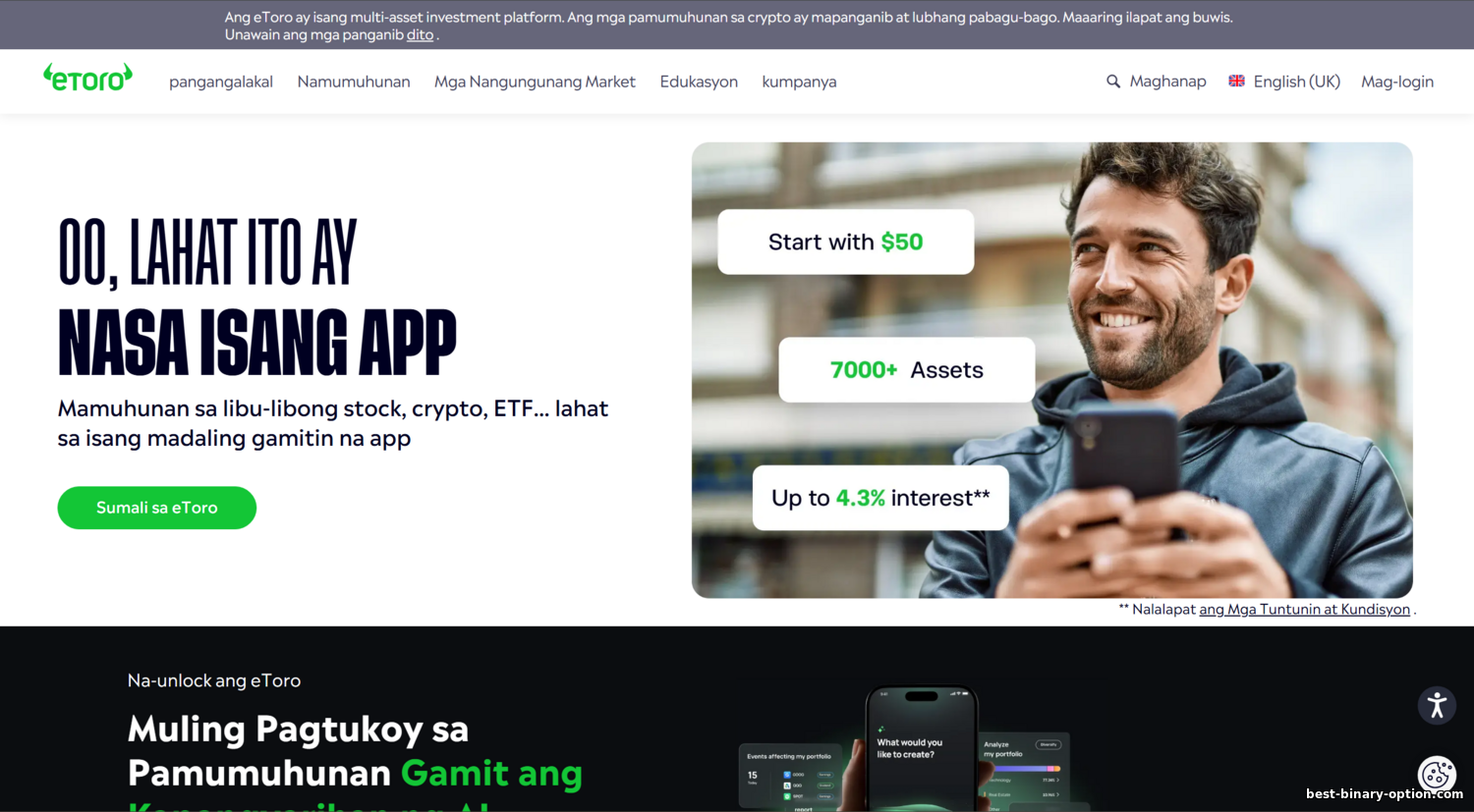 Ano ang eToro at bakit ito kapansin-pansin? Maaari bang pagsamahin ang pangangalakal at social‑network na karanasan? Ipinapakita ng eToro na posible ito. Isa itong internasyonal na online na plataporma sa pamumuhunan na itinatag noong 2007 na nagbibigay ng access sa stocks, cryptocurrencies, ETFs, Forex at iba pang merkado sa pamamagitan ng madaling gamitin na app. Ang tatak ng eToro ay ang kumbinasyon ng isang klasikong online broker at isang social network ng mga mangangalakal kung saan maaaring makipag‑ugnayan ang mga investor at kopyahin ang mga trade ng isa’t isa.