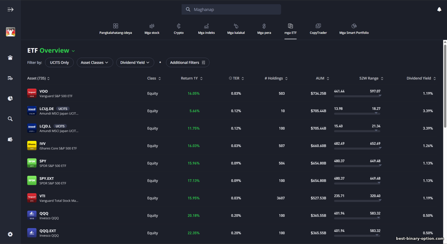 Kabilang sa plataporma ang dose‑doseng kilalang ETF gaya ng mga sumusubaybay sa S&P 500, NASDAQ‑100, ginto, langis, at iba pa. Walang komisyon ang pagbili ng ETF (gaya ng stocks). Maginhawa ito para sa diversipikasyon — maaari kang mamuhunan sa malawak na merkado ng U.S. nang walang dealing fees. Ang unleveraged na pagbili ng ETF ay tunay na asset. Iko‑credit din sa iyong account ang dividends.