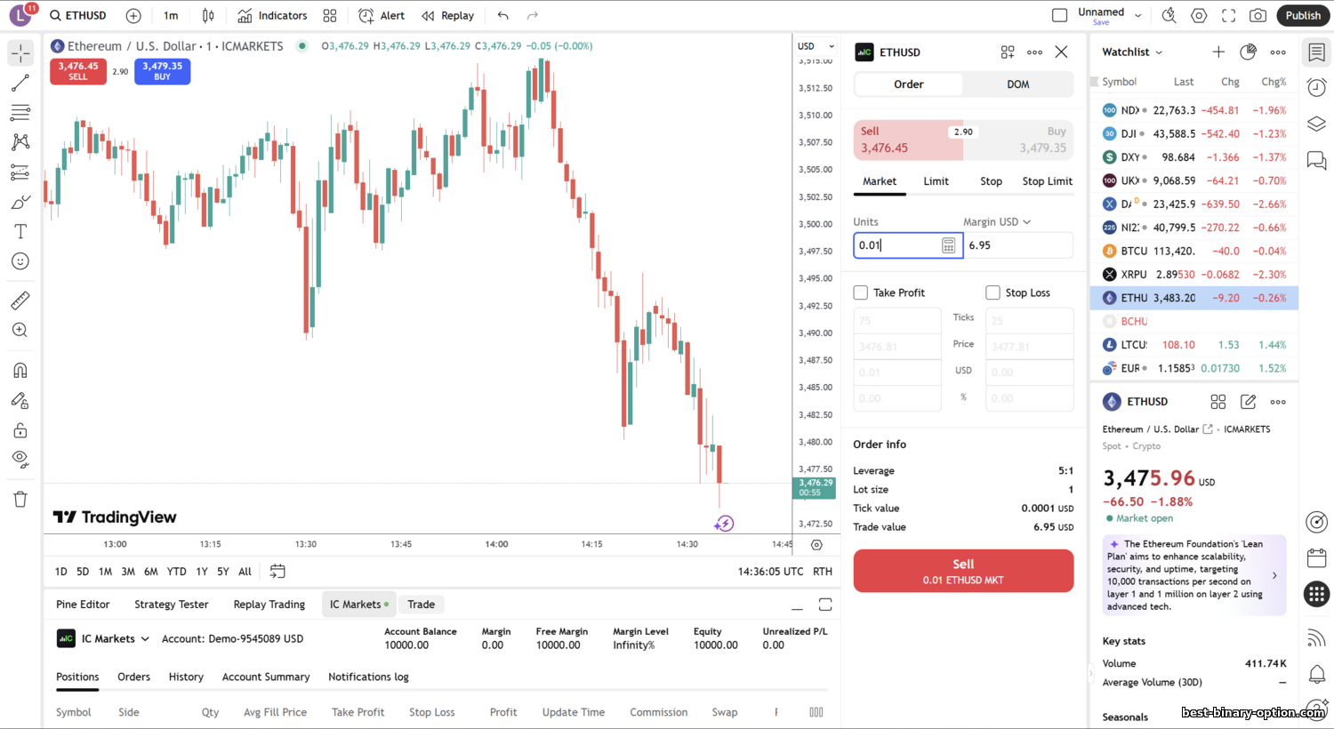 Sa TradingView, piliin ang IC Markets bilang broker, mag‑login sa account, at maglagay ng order direkta mula sa charts. Pinagsasama mo ang malakas na charting at social features ng TradingView sa execution ng IC Markets.