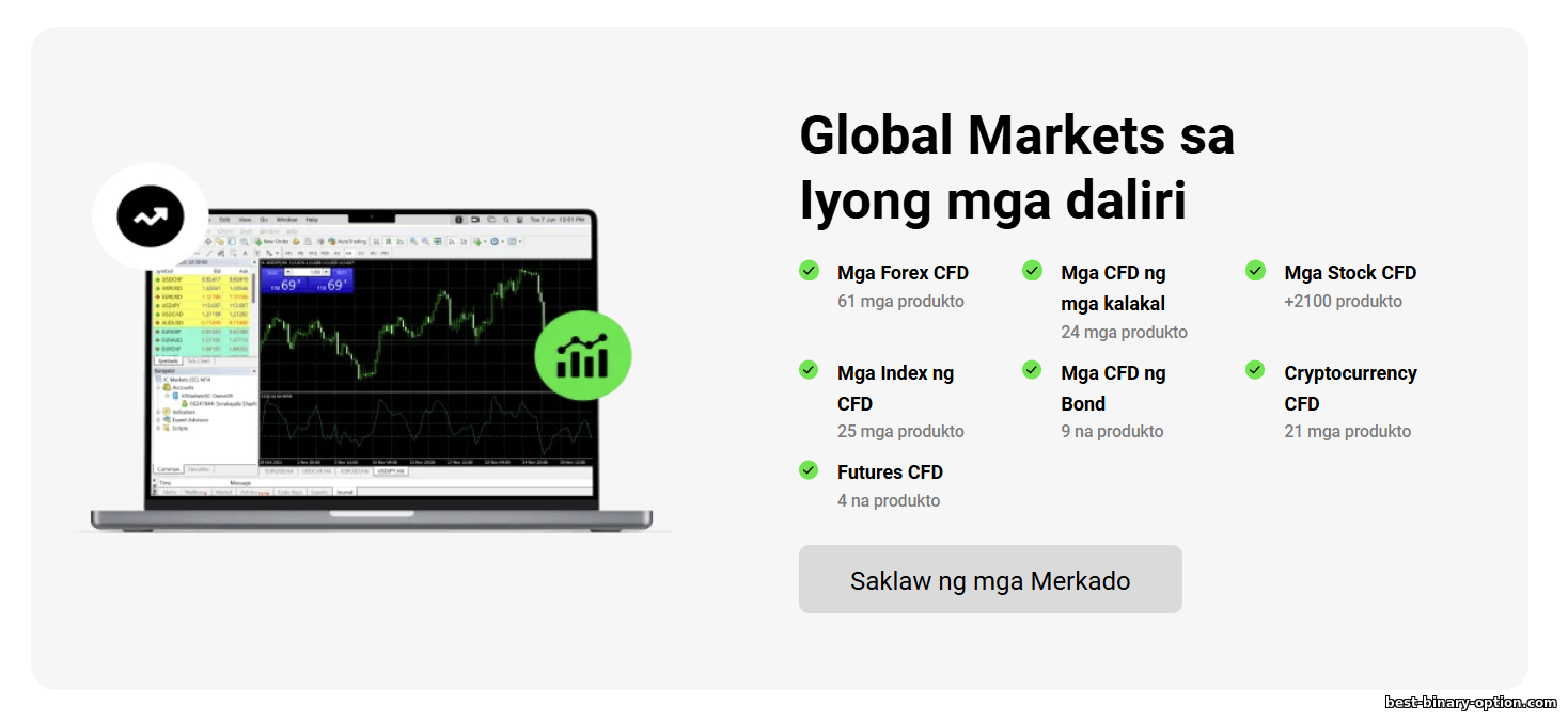 - 2,250+ na instrumento. Access sa 60+ FX pairs, ~23 indices, mga kalakal (langis, metal, agri), 2,100+ stocks at ETFs, at dose-dosenang cryptocurrencies — malakas na diversipikasyon sa iisang lugar.