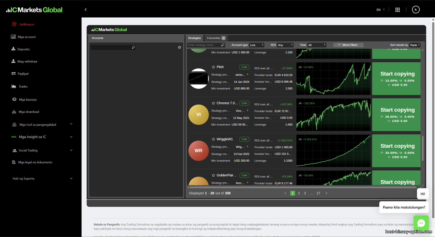 - IC Social — sariling mobile app ng broker para sa social trading. Maaaring maging “signal providers” ang may karanasan, at makakapag‑subscribe ang baguhan. Masusuri mo ang ranggo, performance, at panganib ng providers, saka auto‑copy ng kanilang trades sa account mo. Agarang nagaganap ang pagkopya sa loob ng ecosystem ng IC Markets, kaya minimal ang slippage. Diretsong ruta ito para sa nais sumunod sa mga propesyonal. Transparent ang kabayaran ng providers sa pamamagitan ng fees o profit share.