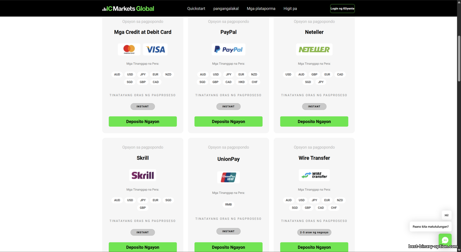 Hindi naniningil ang IC Markets para sa deposito at karamihan ng withdrawals. Anumang paraan ang gamitin mo, kapareho ang matatanggap na halaga (sinasalo ng broker ang bayad sa payment provider). Gayundin para sa withdrawals sa cards at e‑wallets (Skrill, Neteller, PayPal, atbp.) — 0% sa panig ng broker. Namumukod ito kumpara sa mga broker na naniningil ng $10–30 kada withdrawal.
