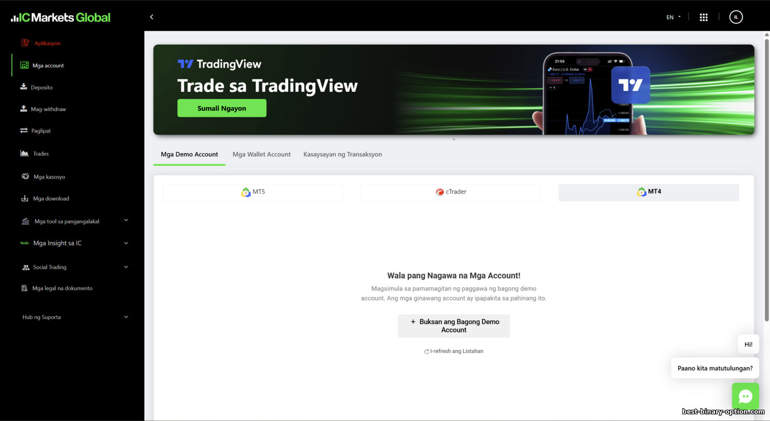 Kakaibang dagdag ang TradingView integration. Maaaring mag‑trade ang mga kliyente direkta mula sa interface ng TradingView gamit ang kanilang IC Markets account. Paano ito gumagana: