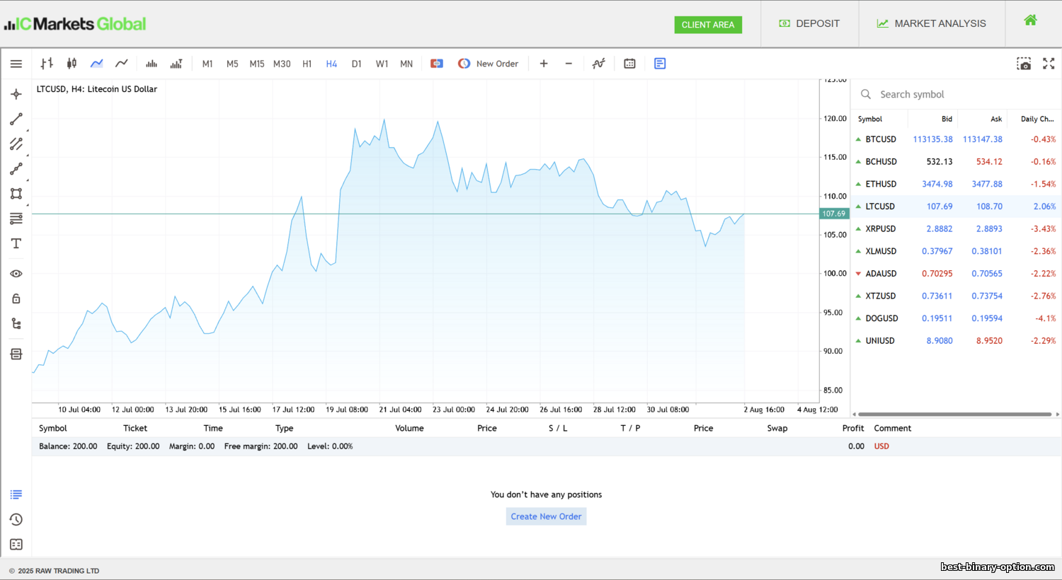 Kasabay ng uso, nag-aalok ang IC Markets ng crypto trading. Kabilang ang 10–20 pares — mahahalagang coin tulad ng BTC/USD, ETH/USD, LTC/USD, XRP/USD, at iba pang altcoins. Nagtetrade ang crypto bilang CFDs, 24/7.