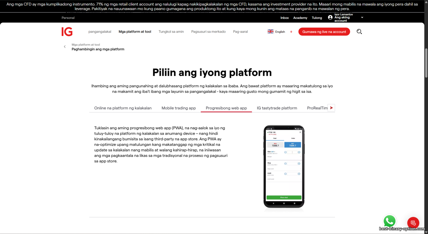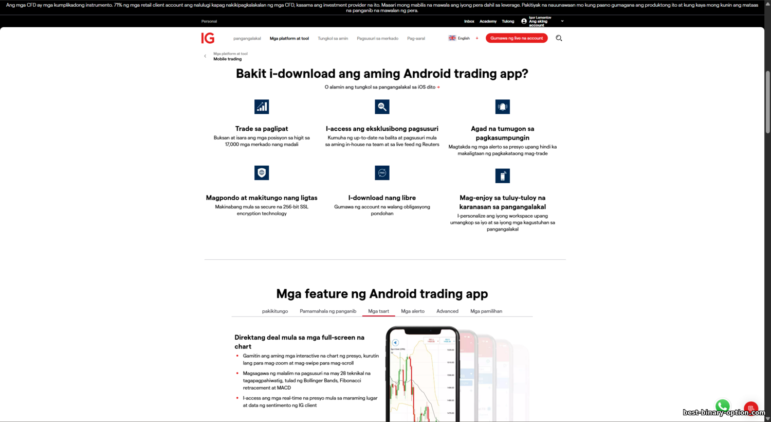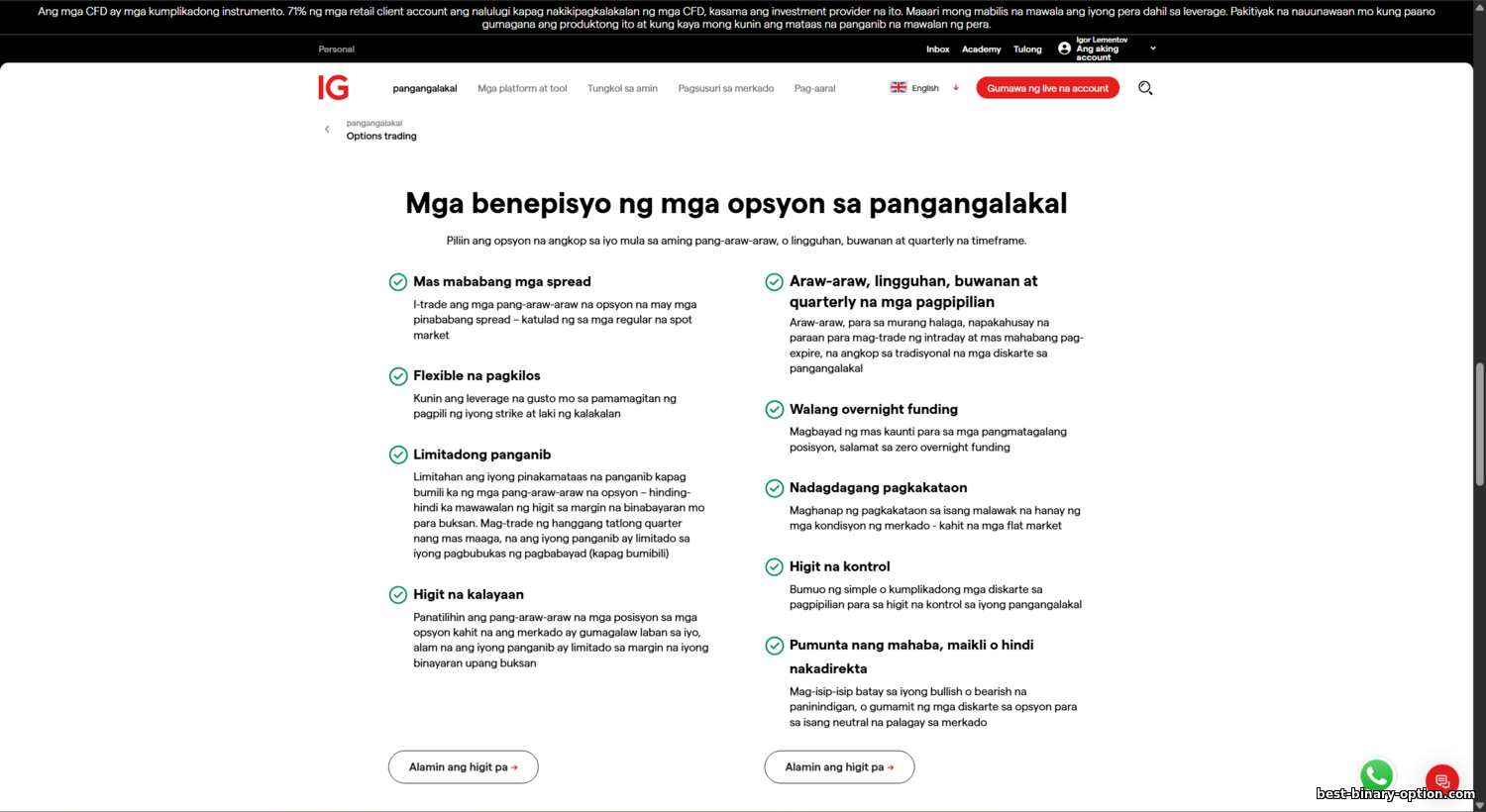 Saan kilala ang IG at ano ang inaalok nito? Pinangunahan ng IG ang financial spread betting — noong dekada 1970, pinayagan nitong sumugal ang mga kliyente sa galaw ng presyo ng ginto noong limitado pa ang pagmamay-ari ng metal. Ngayon, ang IG ay isang multi-asset online broker. Kasama sa produkto ang Forex at CFDs sa lahat ng pangunahing asset class (currencies, shares, indices, commodities, crypto, atbp.), access sa tunay na shares at ETFs para sa ilang bansa, mga option, at mga makabagong in-house na instrumento. Halimbawa, nilikha ng IG ang Turbo24 — ang kauna-unahang exchange-traded na turbo warrants na available 24 oras, 5 araw kada linggo. Pinapahintulutan ng Turbo24 ang mga trader sa Europa na magtakda ng knockout (barrier) na naglilimita sa panganib at sa esensya ay tumutukoy sa leverage. Nag-aalok din ang IG ng vanilla at barrier options sa FX, indeks, at commodities — available sa mga kliyente sa ilang bansang Europeo. Sa UK at Ireland, tradisyonal na nagbibigay ang IG ng financial spread betting — isang tax-efficient na paraan ng spekulasyon na patok sa mga trader sa UK.