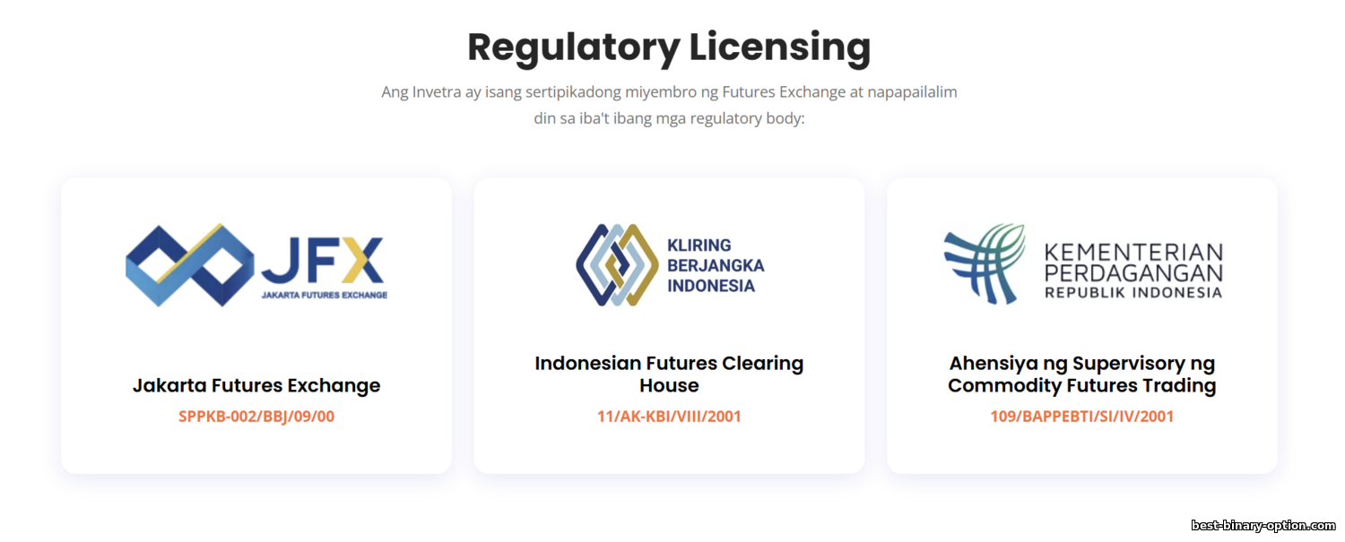 Sinasabi ng Invetra na ito ay ganap na lisensyado at nire-regulate sa Indonesia. Nasa ilalim ito ng BAPPEBTI—ang Commodity Futures Trading Authority ng Indonesia (ahensya ng gobyerno na nangangasiwa sa derivatives markets). May awtorisasyon ang Invetra mula sa BAPPEBTI: ayon sa publikong mapagkukunan, No. 109/BAPPEBTI/SI/IV/2001. Ipinapahiwatig ng numero ang Abril 2001. Tulad ng nabanggit, orihinal itong iginawad sa Jalatama Artha Berjangka (ang nauna sa Invetra). Nanatiling balido ang lisensya at epektibong muling inirehistro sa PT Invetra Teknologi Berjangka noong 2024 nang mapalitan ang pangalan.