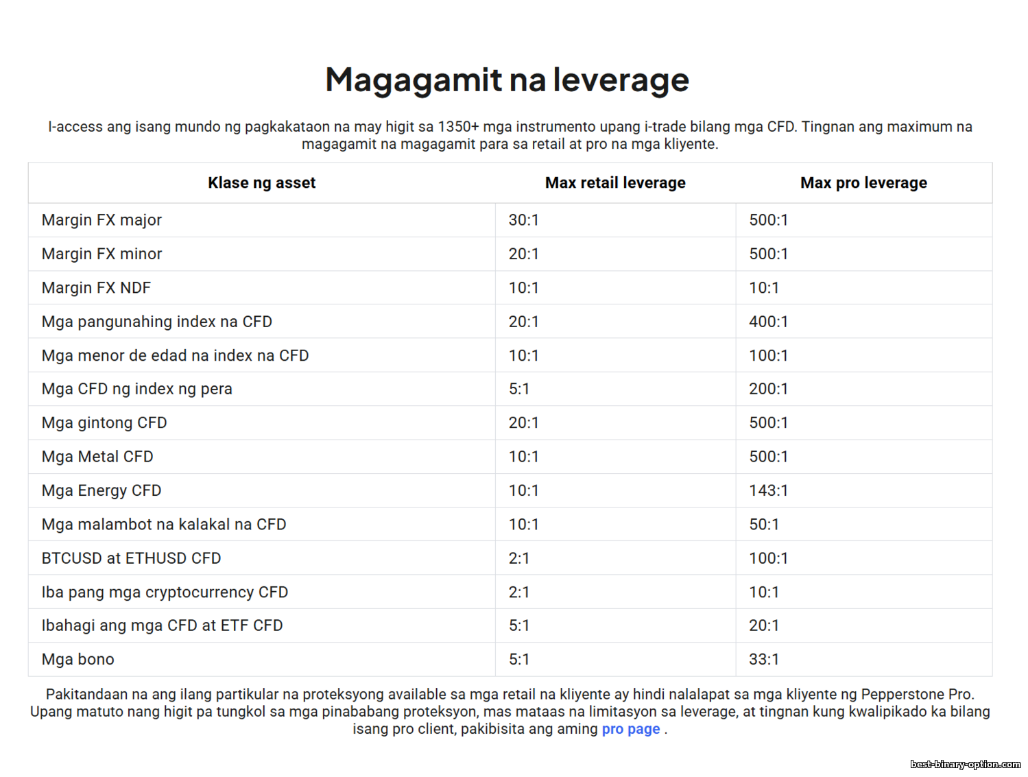 Maximum 1:500. Available sa international entity ng Pepperstone (SCB, The Bahamas) o Kenya (CMA) para sa kliyenteng wala sa EU/UK/Australia. Sa $1,000 sa account, maaari mong kontrolin ang hanggang $500,000. 0.2% ng notional ang margin. Karaniwang cap: FX at metals hanggang 1:500; indices 1:100–1:200; share CFDs hanggang 1:20; crypto madalas 1:2 (minsan 1:5 depende sa hurisdiksiyon). Bagama’t hindi maaaring ialok ito sa retail sa EU dahil sa ESMA, maaaring gawin ito ng offshore entity ng Pepperstone—na pinahahalagahan ng maraming bihasang trader.