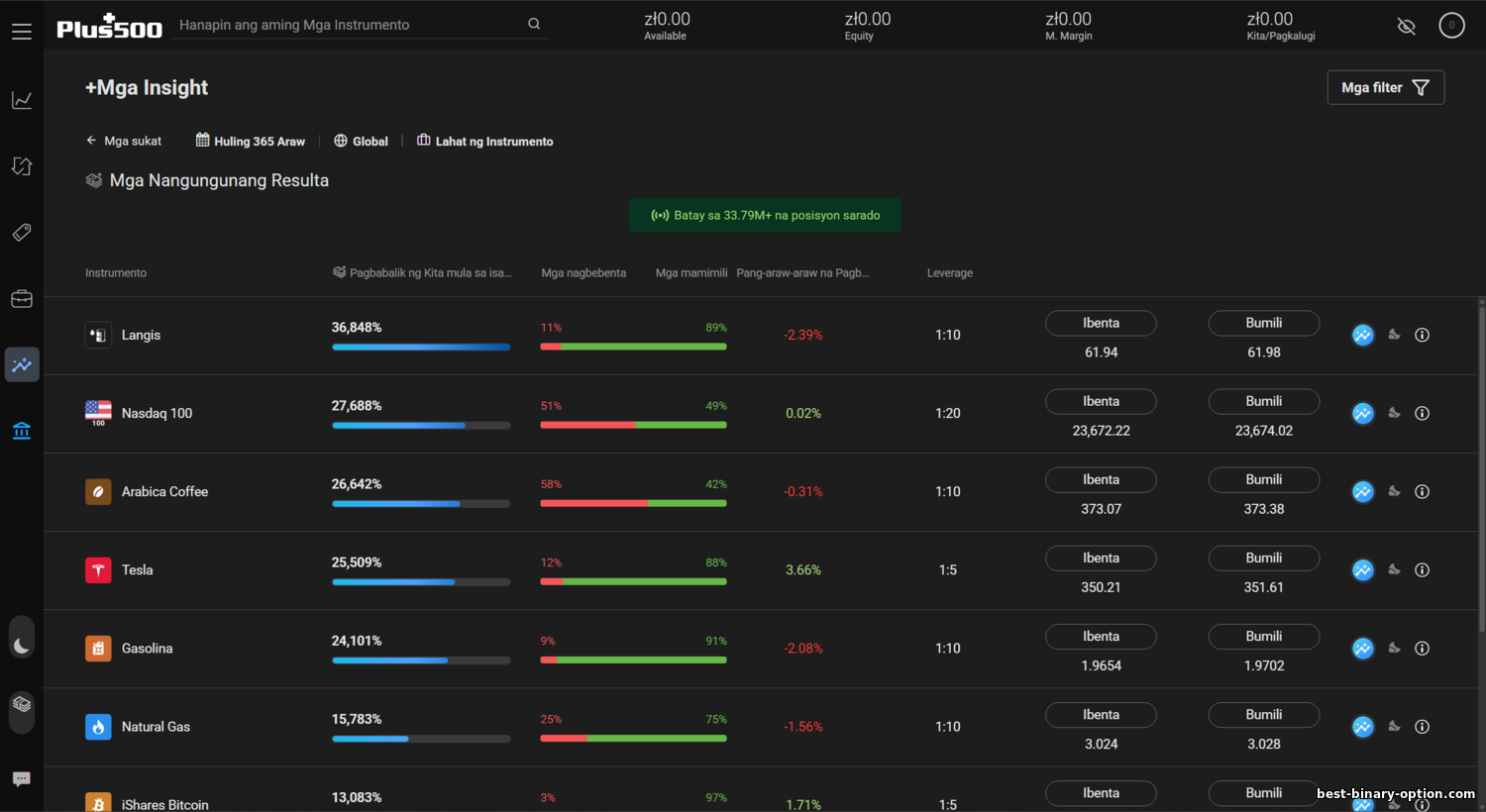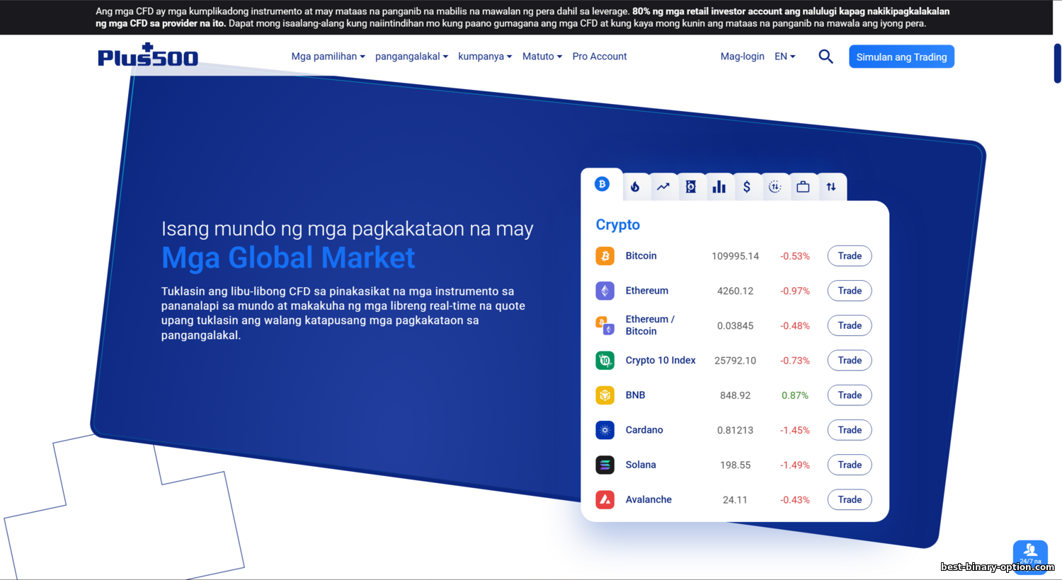 - Malawak na hanay ng instrumento. May higit 2,800 merkado ang Plus500: forex, stocks, stock indices, commodities, cryptocurrencies, ETFs, at maging options bilang CFDs. Puwede kang mag‑diversify at mag‑explore ng iba’t ibang merkado nang hindi nagpapalit ng broker.