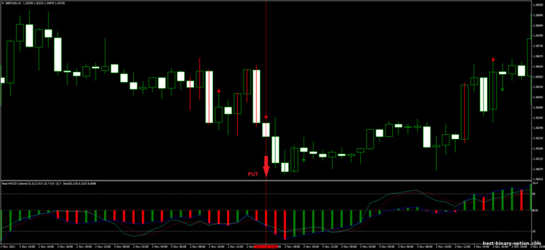 - Ang MACD histogram ay pula at mas mababa sa zero level