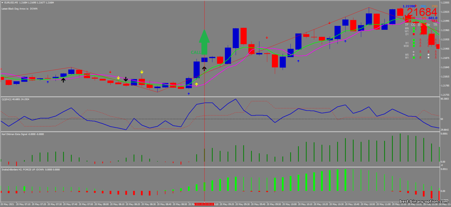 - Sa indicator ng QQE, ang pulang tuldok na linya ay mas mataas kaysa sa asul