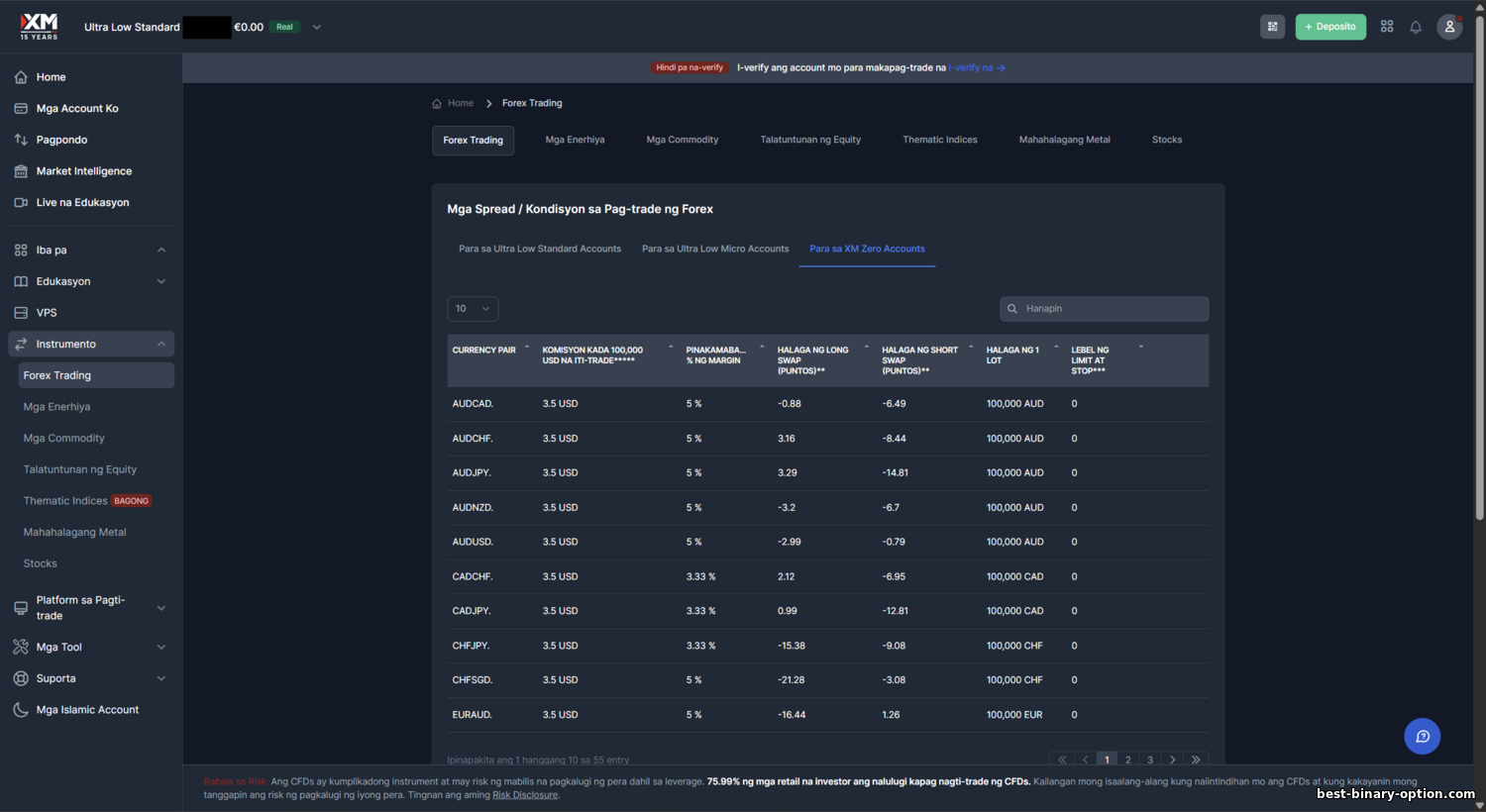 - XM Zero Account: minimal na spreads mula 0.0 na may nakapirming komisyon. Historikal na naniningil ang XM ng $3.5 per 100k per side (i.e., $7 per full‑lot round turn). Spreads sa majors: ~0.0–0.3 pips (malapit sa interbank). Hindi available ang XM Zero sa lahat ng hurisdiksiyon; sa ilang rehiyon, Ultra Low ang pumapalit. Kung inaalok ang Zero sa iyong rehiyon, ito’y para sa mga may karanasang trader na nais ang pinakamakipot na spread. Minimum na deposito ay $5 din; leverage hanggang 1:500 (dating limitado). Para sa precious metals, walang komisyon ang XM kahit sa Zero — hal., maaaring ikalakal ang ginto na may ~$0.2 spread at walang dagdag na bayad. Tandaan: hindi laging inilalathala ng XM ang average Zero spreads (isang puwang sa transparency na binanggit ng ilang reviewer), kaya marami ang pumipili ng Ultra Low bilang simpleng alternatibong walang komisyon.