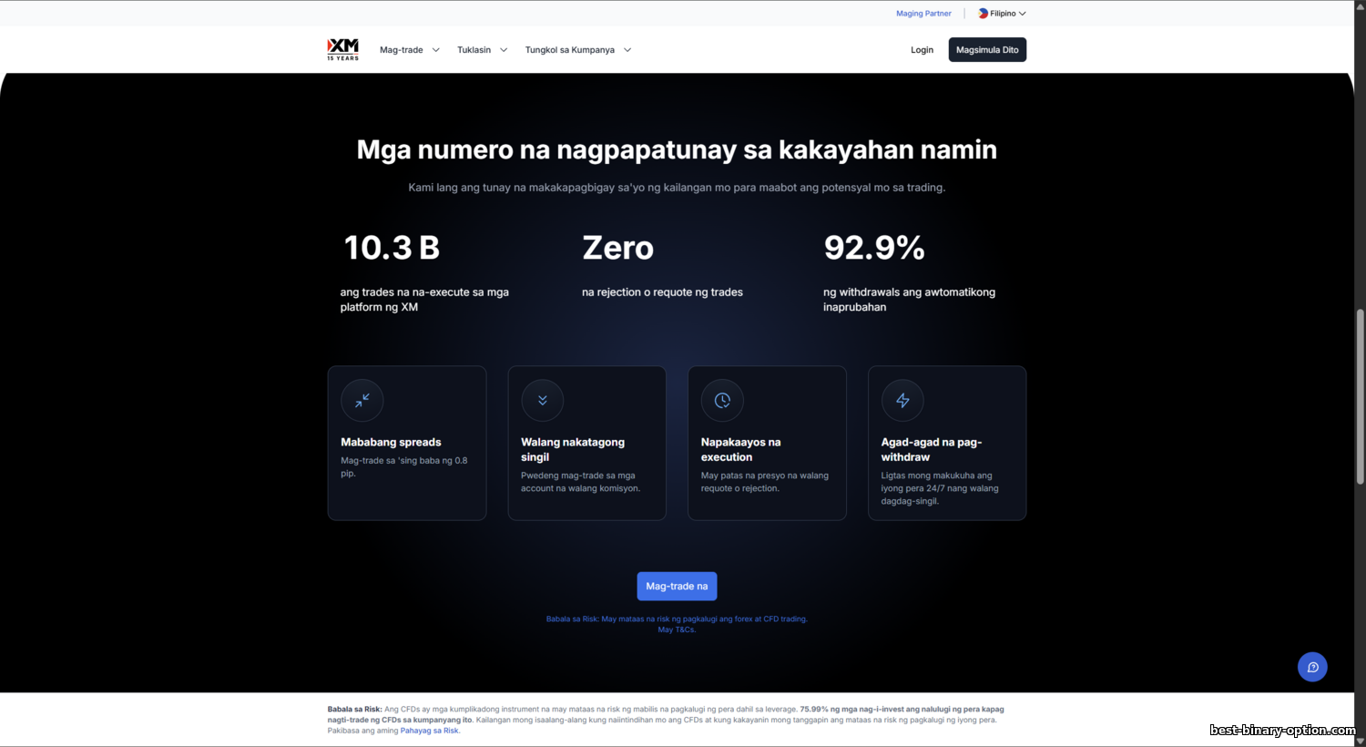 Dahil sa napakababang minimum na deposito (mula $5) at malawak na edukasyon, akma ang XM para sa mga baguhan — maaari kang magsimula nang maliit at matuto sa pamamagitan ng webinars at demo account. Nakakuha pa nga ang XM ng mga parangal bilang “Best Broker for Beginners” sa ilang rehiyon. Kasabay nito, makikinabang ang may karanasang trader sa kompetitibong spreads (lalo na sa Ultra Low accounts), mataas na leverage na 1:1000 (sa labas ng EU), mabilis na pag‑withdraw ng kita, at mga advanced na serbisyo (VPS para sa algo traders, loyalty program, dedicated managers para sa VIP). Sinusuportahan ng XM ang mga kliyente mula sa 190+ bansa, kabilang ang CIS — available ang website at suporta sa Russian at 30+ iba pang wika. Isa itong tunay na global na online na broker na may lokal na suporta.