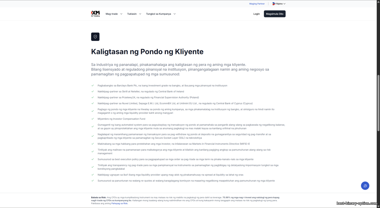| Proteksyon sa pondo | Segregated accounts, negative balance protection, investor compensation fund (EU) |