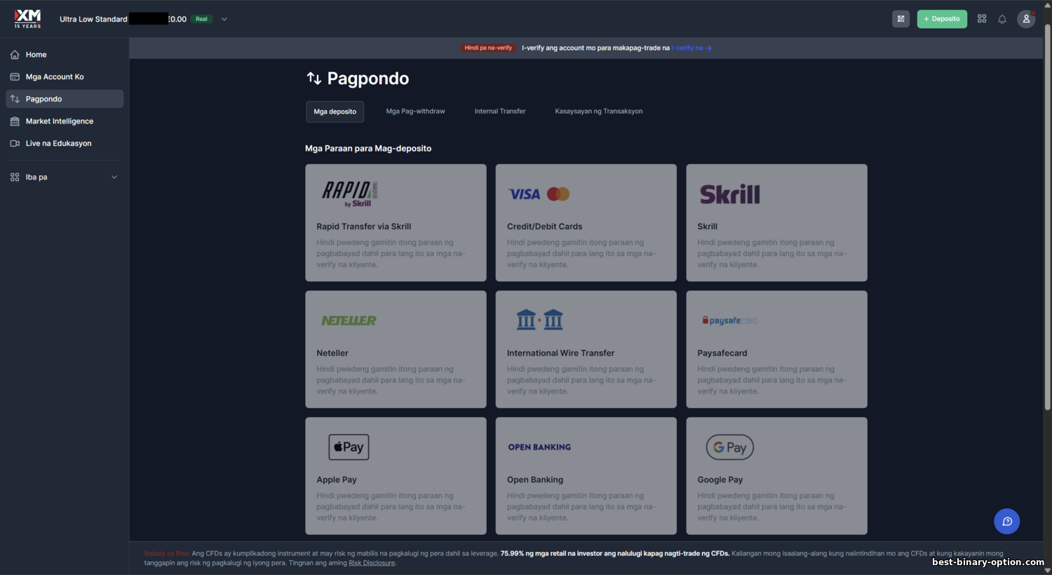 Mga account, rehiyon, at limitasyon: Pinapayagan ng XM ang hanggang 8 account bawat tao — maginhawa para paghihiwalay ng strategy o base currency (hal., USD at EUR account para iwas conversion). Ipinagbabawal ang maraming profile sa ibang pangalan. Mga limitasyong pang‑rehiyon: hindi pinaglilingkuran ng XM ang mga residente ng U.S., Canada, Israel, Iran, North Korea, at ilang bansang may sanction. Ang mga kliyente mula Russia, Ukraine, Belarus, Kazakhstan, at karamihan sa iba pang bansa ng CIS ay tinatanggap sa pamamagitan ng XM Global (offshore). Nakakakuha sila ng leverage hanggang 1:1000, mga bonus, at iba pang benepisyo, habang maaaring itago ang pondo sa mga European bank sa pamamagitan ng Cyprus entity — maginhawa at legal na estruktura.