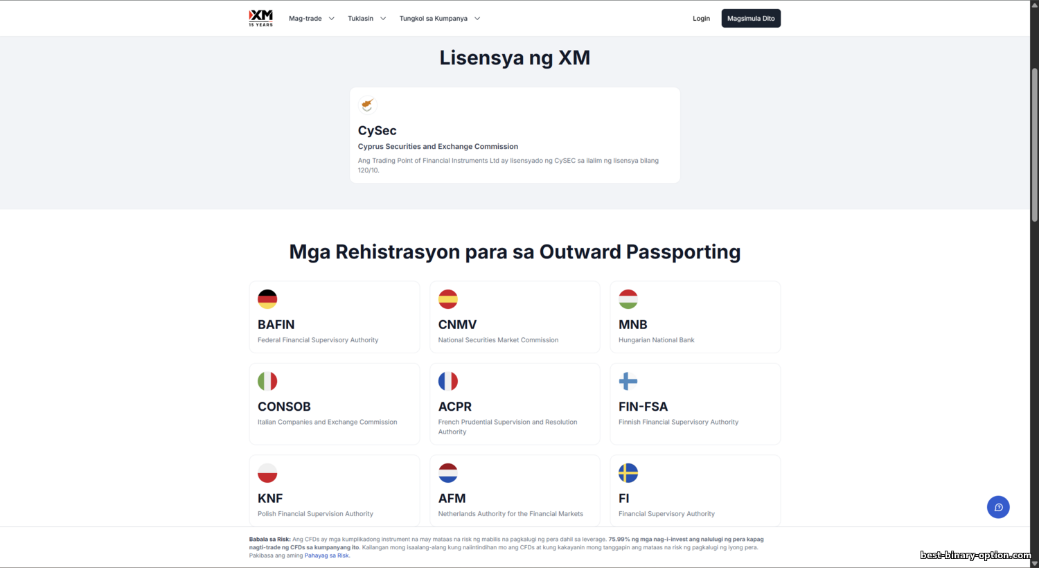 - CySEC (Cyprus) — lisensya Blg. 120/10 para sa Trading Point of Financial Instruments Ltd. Ang Cyprus Securities and Exchange Commission ay Tier‑1 EU regulator (MiFID II). Pinaglilingkuran ng CySEC entity ang mga kliyenteng Europeo, at sinisiguro ang mga patakaran ng ESMA (leverage hanggang 1:30, proteksyon ng mamumuhunan, atbp.).